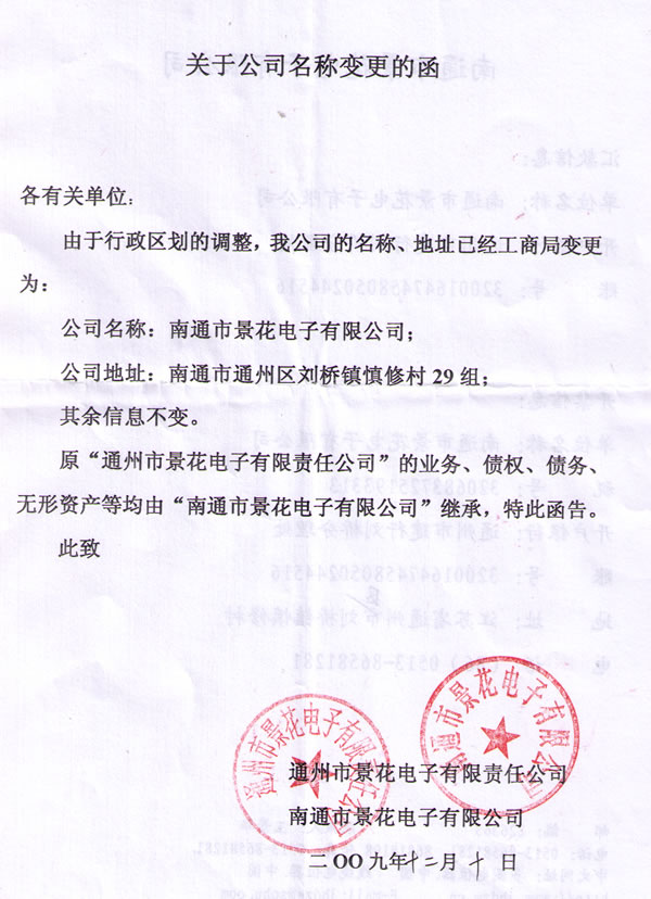 由于行政區劃調整,原南通市下轄的通州市已經更改為南通市通州區,我公司的名稱和地址已相應變更。